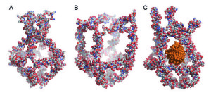 La figura mostra una nanocage in cui otto molecole di DNA unici sono mescolati insieme. Ha quattro elementi funzionali che si trasformano in risposta ai cambiamenti della temperatura circostante.